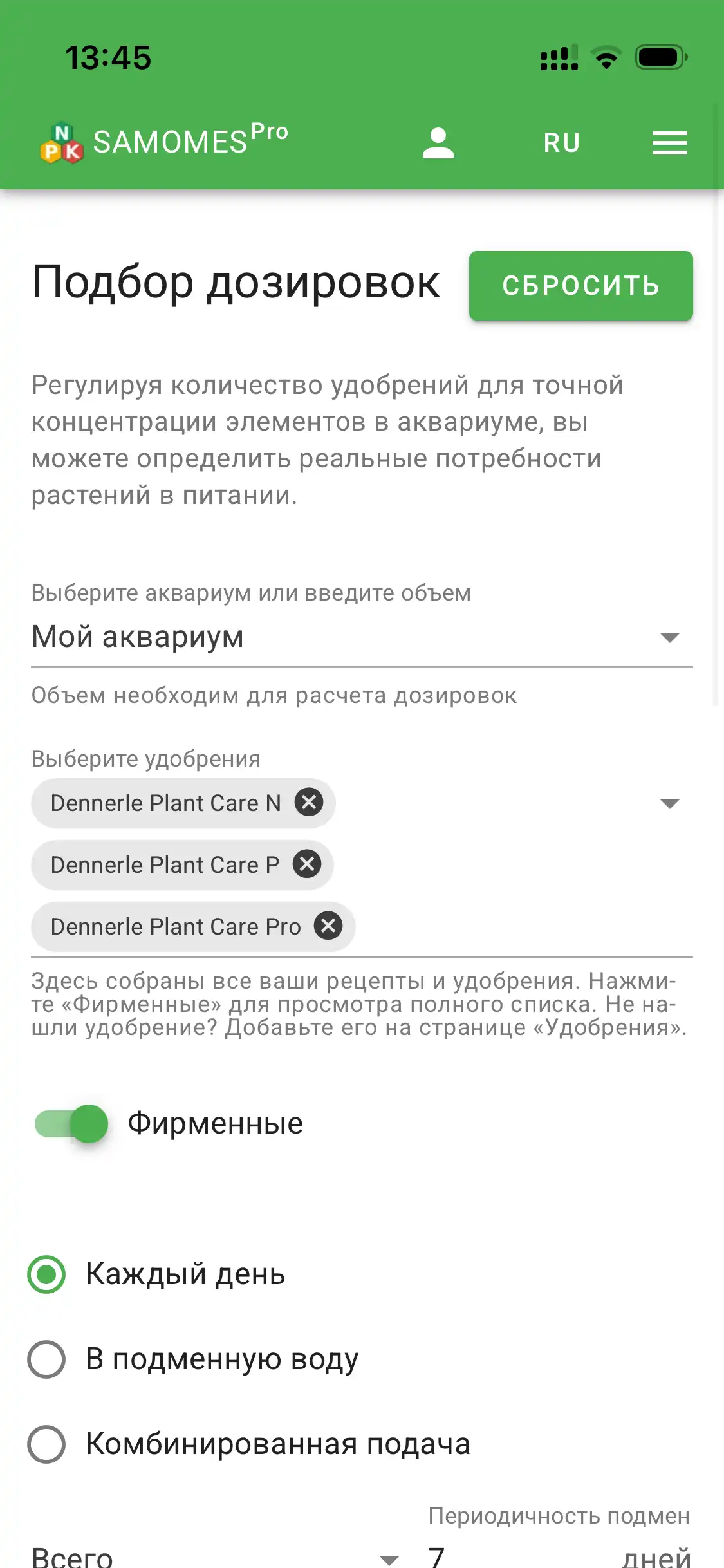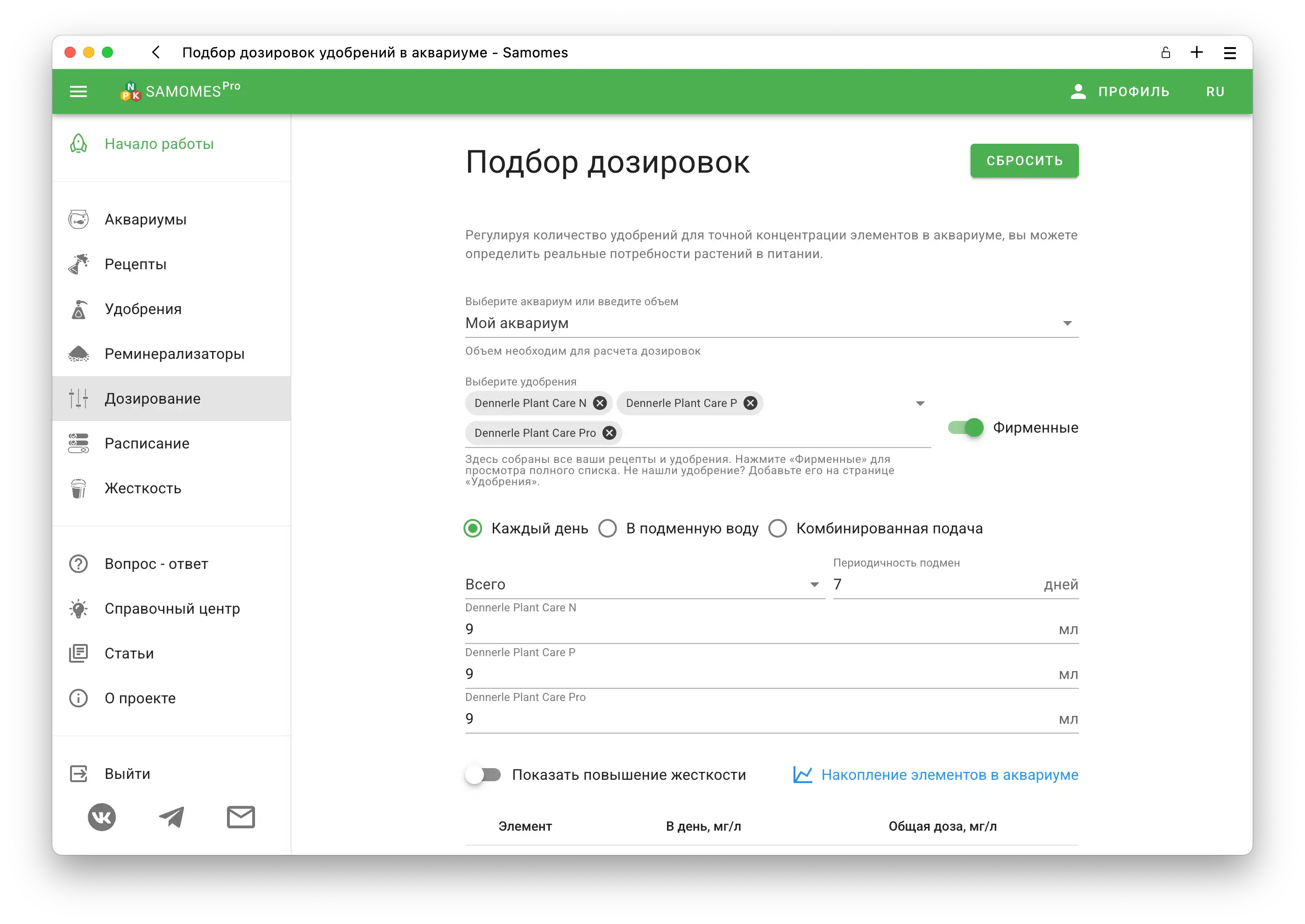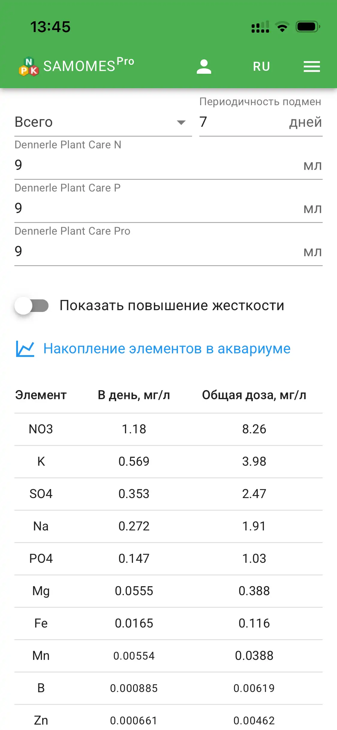 Добавив удобрения, укажите количество каждого вносимого удобрения — так вы получите точный расчёт всех элементов, поступающих в аквариум.