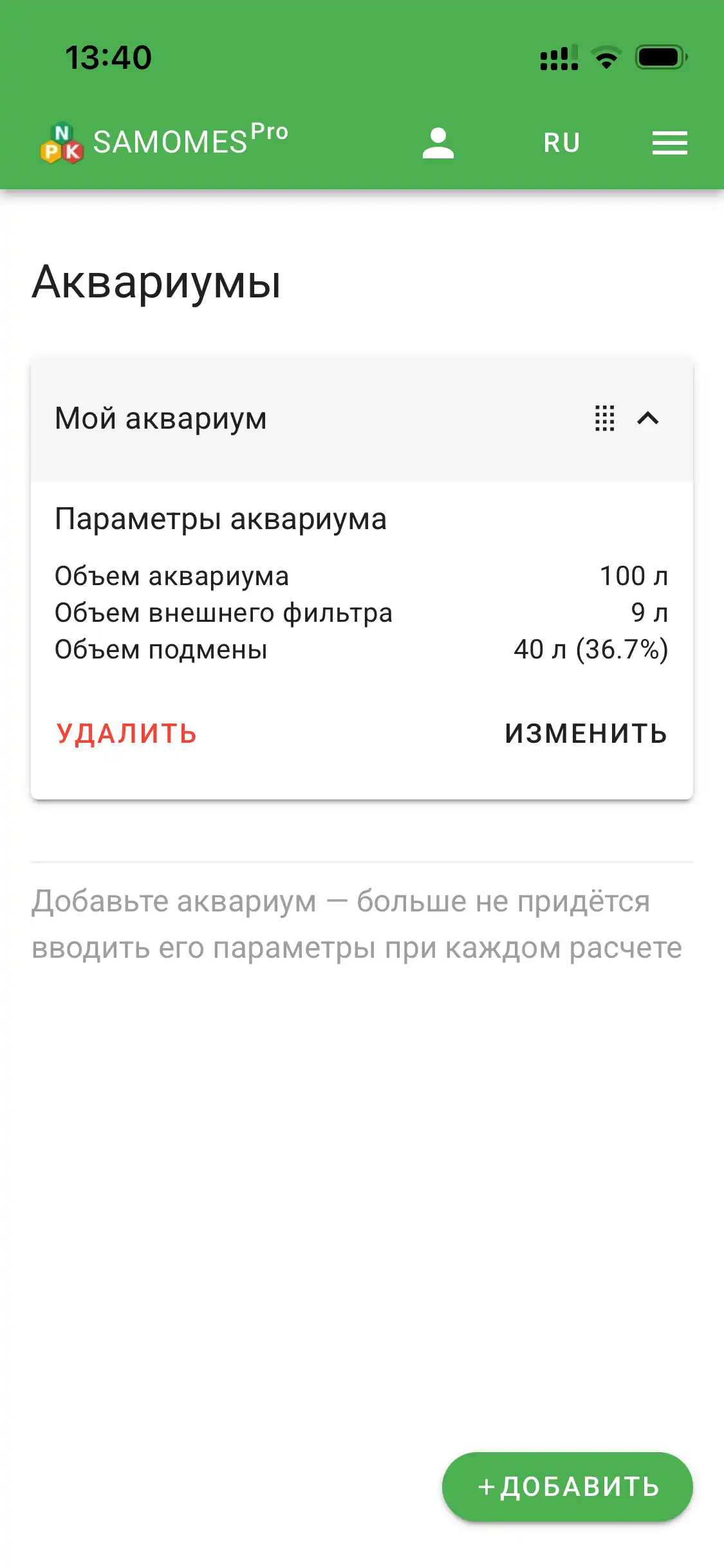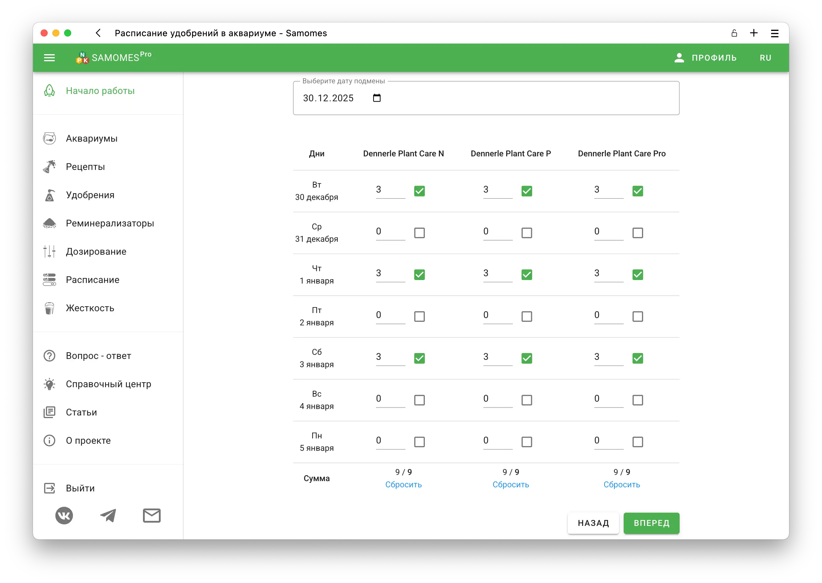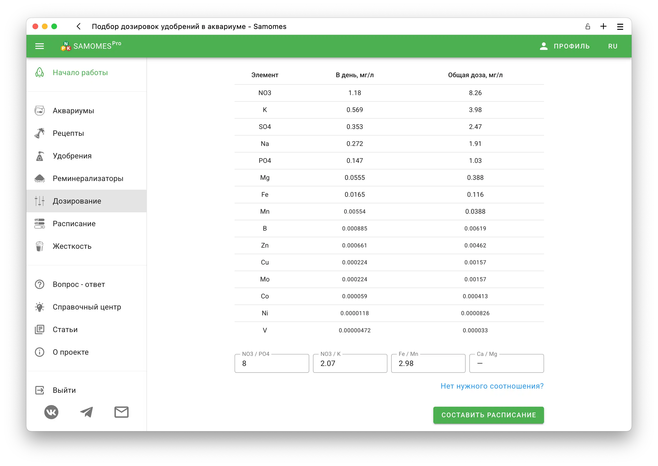 Добавив удобрения, укажите количество каждого вносимого удобрения — так вы получите точный расчёт всех элементов, поступающих в аквариум.