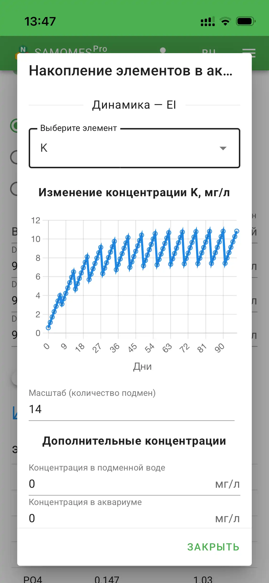 - Выберите интересующий элемент (NO3, PO4, K, Mg).