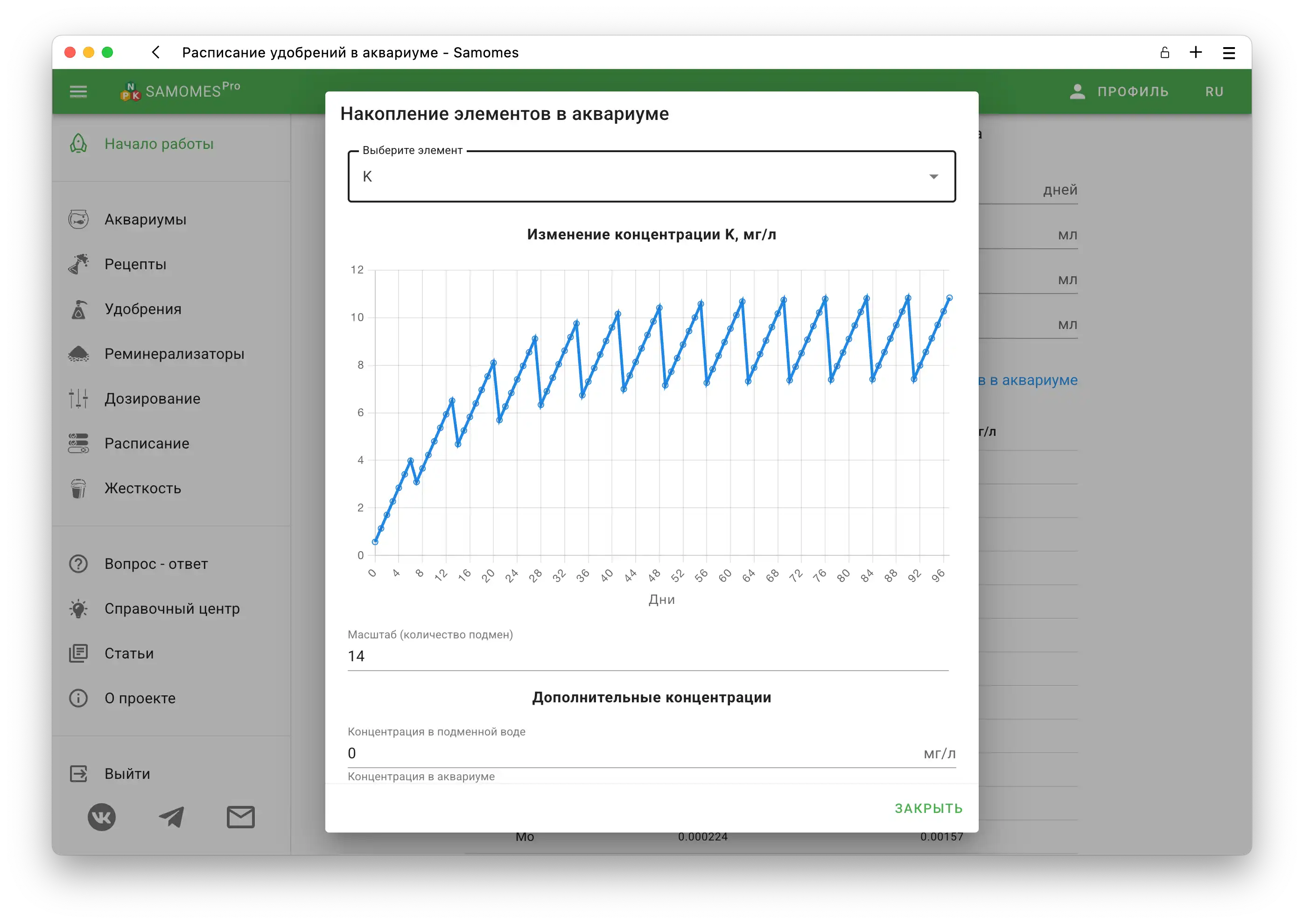 Samomes показывает, как элементы накапливаются в вашем аквариуме после каждого внесения удобрений и подмены воды. На графиках вы видите, как аквариум постепенно находит своё равновесие.