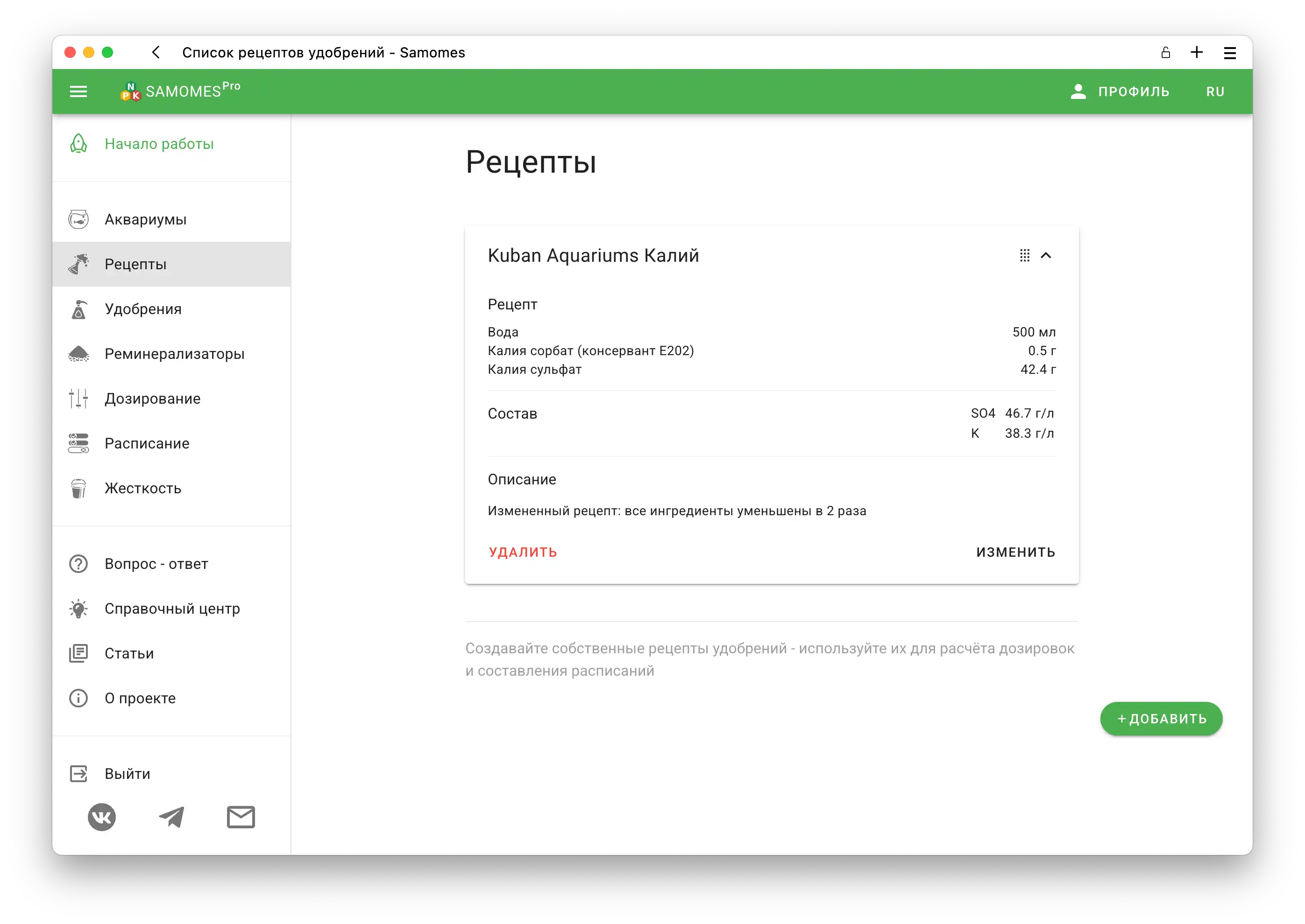 - Чтобы узнать больше о том, как создавать собственные рецепты удобрений и адаптировать классические рецепты, воспользуйтесь информацией из раздела “Рецепты”.