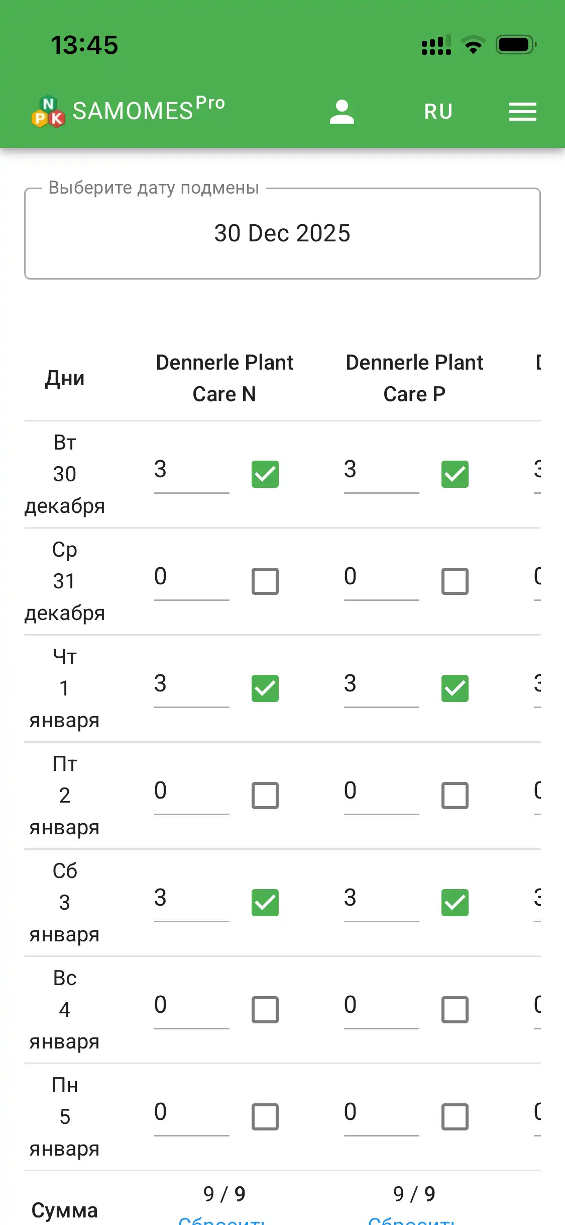 - Выберите дни внесения удобрений.