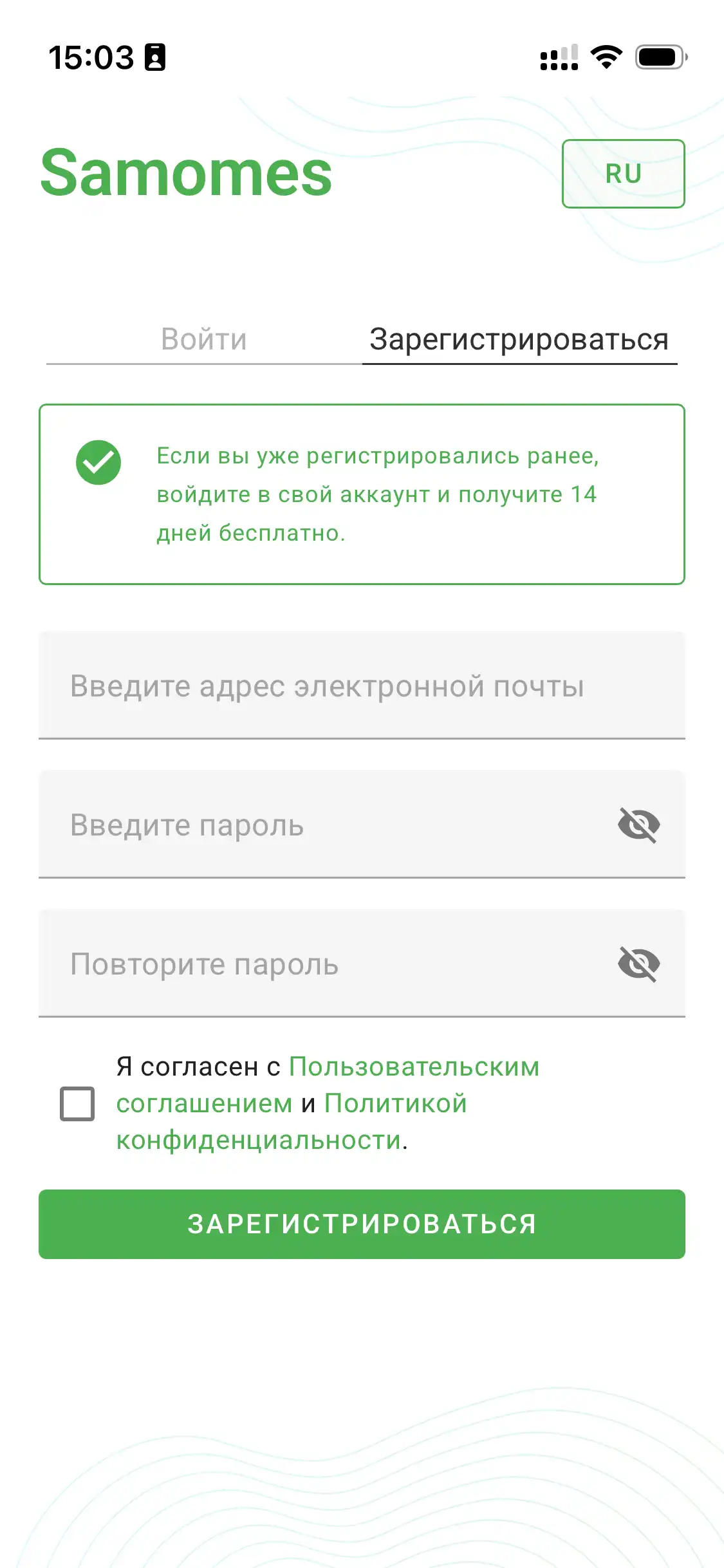 Создайте личный аккаунт в Samomes за несколько секунд. Если у вас уже есть существующий аккаунт, войдите в него с помощью почты и пароля.